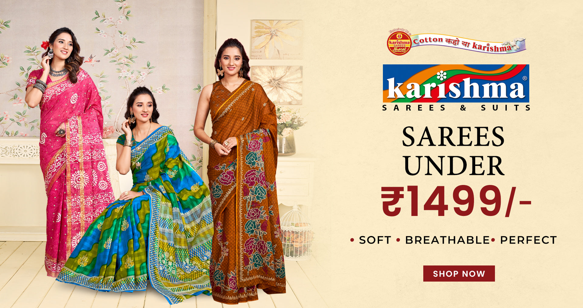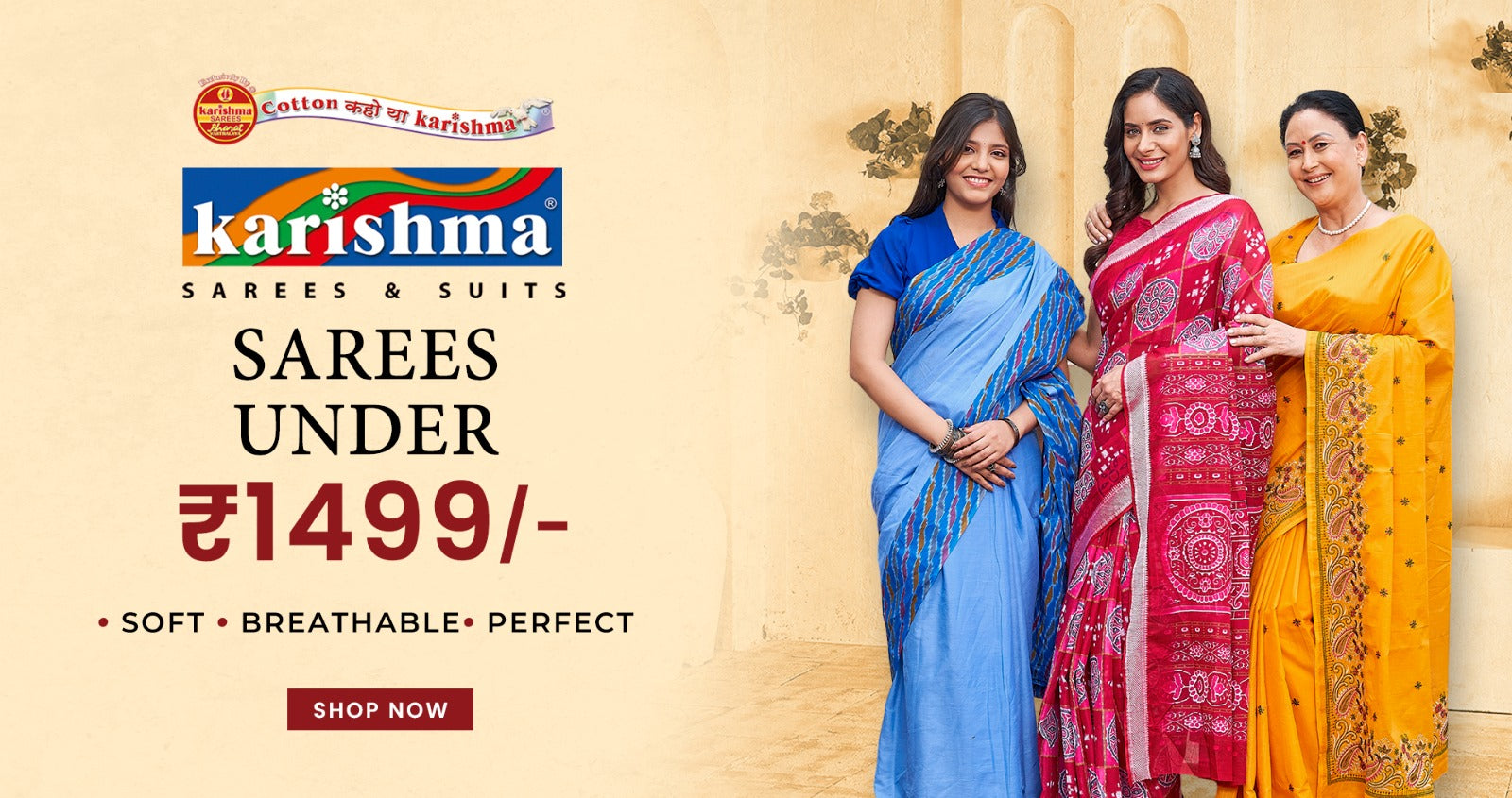 For over 40 years, Karishma Sarees has been woven into India’s everyday life. Trusted by over 3 crore women and available in 30,000+ stores, we bring pure cotton, timeless designs, and a legacy carried forward by generations of women. Every drape is more than fabric — it’s tradition, trust, and Karishma.