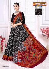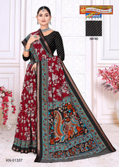 "Pure Cotton (Soft) Malai Saree With Modern Design And Simple Border Blouse Pc Attached The Saree comes with the Traditional style Colour Mix in Soft Cotton Fabric along with highlighted designs printed on top and a Thick Zari Border all around.