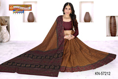 "Pure Cotton Muslin (Soft) Saree With Simple Print And Unique Big Border Blouse Pc Attached The Saree comes with the Traditional style Colour Mix in Soft Cotton Fabric along with highlighted designs printed on top and a Thick Zari Border all around.