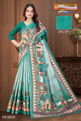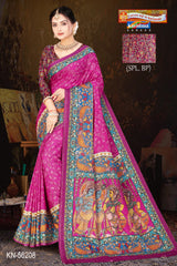 "Pure Cotton (Soft) Malai Saree With Beautiful Modern Figure Design Pallu And Blouse Pc Attached The Saree comes with the Traditional style Colour Mix in Soft Cotton Fabric along with highlighted designs printed on top and a Thick Zari Border all around.