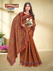 "Pure Cotton (Soft) Muslin Saree With Checks Pattern & Delicate Floral Print Blouse Pc Attached. The Saree comes with the Traditional style Colour Mix in Soft Cotton Fabric along with highlighted designs printed on top and a Thick Zari Border all around.