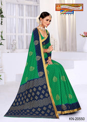 "Pure Cotton (Masleen) Saree With Tradional Pasely Design Blouse Pc Attached. The Saree comes with the Traditional style Colour Mix in Soft Cotton Fabric along with highlighted designs printed on top and a Thick Zari Border all around.