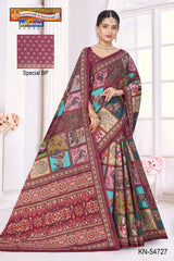 "Pure Cotton (Soft) Malai Saree With Figure Print And Intricate Pallu Blouse Pc Attached The Saree comes with the Traditional style Colour Mix in Soft Cotton Fabric along with highlighted designs printed on top and a Thick Zari Border all around.