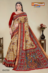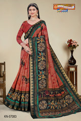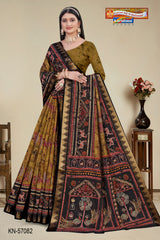 "Pure Cotton (Soft) Malai Saree With Modern Design And Figure Blouse Pc Attached The Saree comes with the Traditional style Colour Mix in Soft Cotton Fabric along with highlighted designs printed on top and a Thick Zari Border all around.