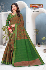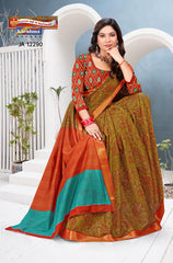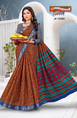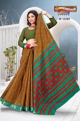 "Pure Cotton Saree Malai (Soft) Saree With Paisely Design And Golden Border Blouse Pc Attached The Saree comes with the Traditional style Colour Mix in Soft Cotton Fabric along with highlighted designs printed on top and a Thick Zari Border all around.
